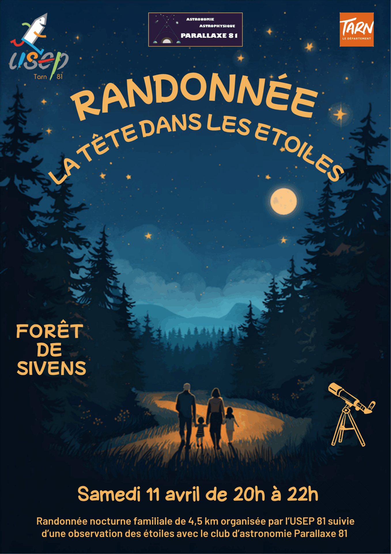 L'USEP du Tarn organise des rencontres sportives associatives à destination des enfants licenciés et de leur famille. Notre première journée départementale " Sports en Famille " se déroulera le samedi 11 avril 2026 de 19h45 à 22h00 à la forêt de Sivens (Maison Forestière de Sivens 81310 LISLE-SUR-TARN). Cette rencontre est à destination des enfants à partir 6 ans (GS) au cycle 3 (CM2) licenciés à l'USEP. (ouvert à tous les membres de la famille dont l’enfant est licencié Usep) Equipement : Chaussures de marche (ou bonnes chaussures de sport) obligatoires, lampe, bouteille d’eau, stylos, petit sac à dos, sac pour ramasser des éléments de la nature Au programme : 19h45 : accueil et explication de la soirée 20h- 21h30 : randonnée sentier La Combe del Loup 21h30 : observation des étoiles et création artistique collective Pour vous inscrire, veuillez compléter le formulaire ci-dessous. Fin des inscriptions au mardi 7 avril dernier délai. Possibilité de pique-niquer sur place avant la randonnée. En espérant vous savoir nombreux à nos côté lors de cette soirée. La commission rencontre en famille de l'USEP du Tarn.