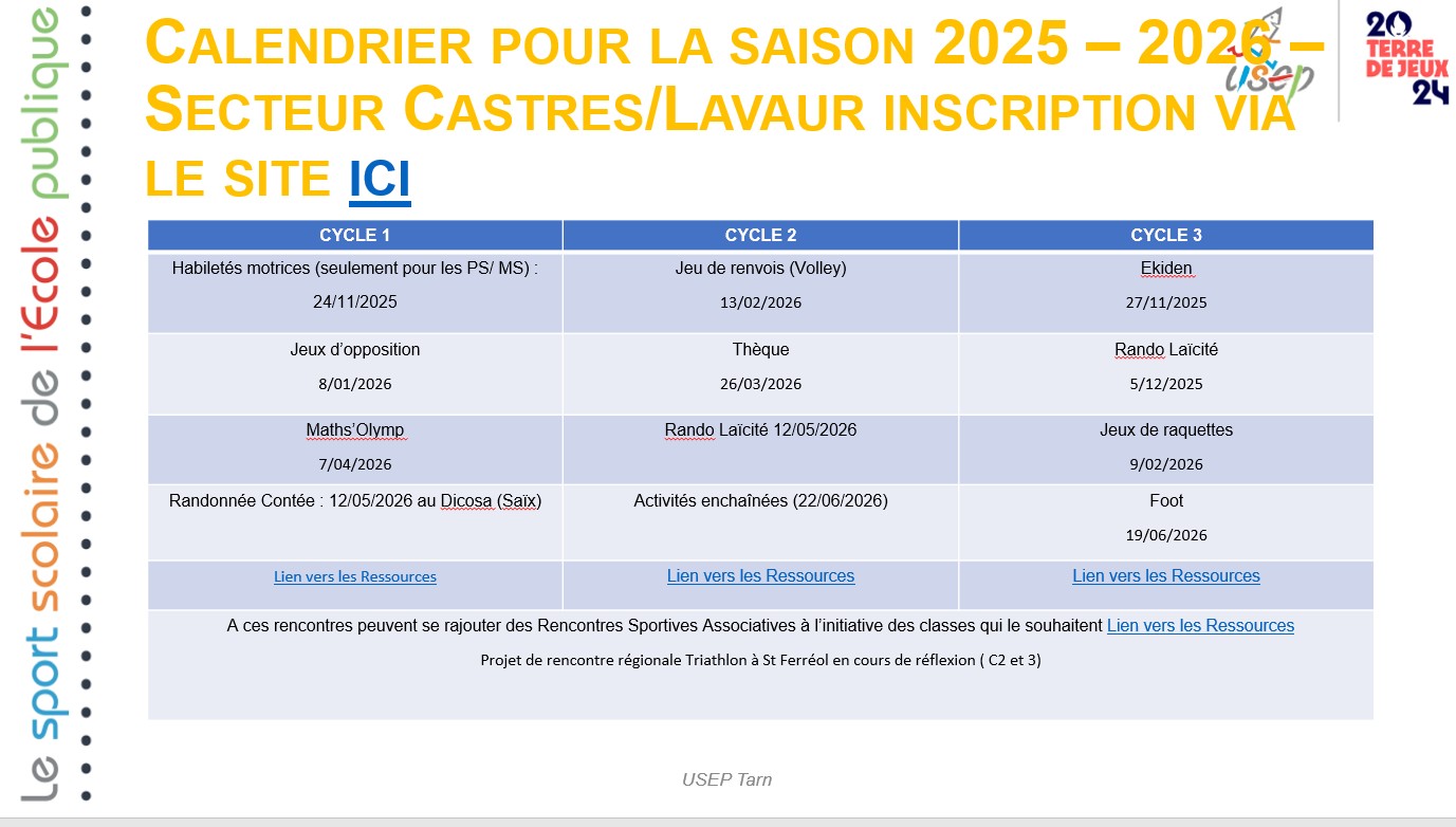Voici le diaporama de présentation du 3/09/2025 : Powerpoint anim peda USEP rentrée 2025 du 3 septembre 2025 secteur Castres Lavaur Saix