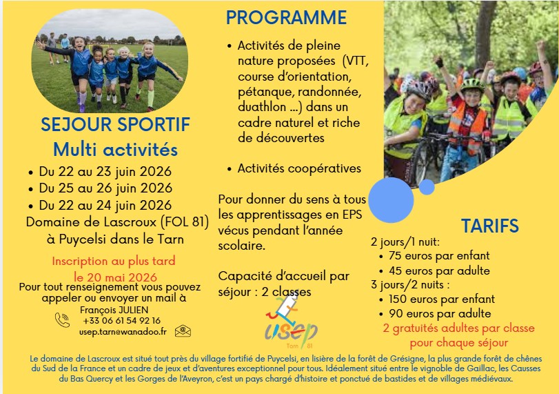Vous n'avez pas encore de sortie scolaire programmée pour la fin de l'année? Vous souhaitez vivre une expérience sous le signe de la coopération, du sport et du partage au coeur de la nature? L'USEP vous porpose de partir 2 ou 3 jours selon votre choix ou vos possibilités. N'hésitez pas à nous contacter pour tout renseignement complémentaire.